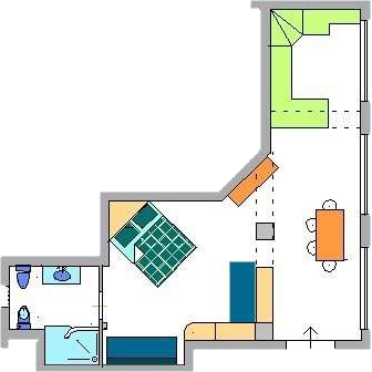 It is a very wide open space with a double bed and two single beds. Bathroom with large built-in shower.